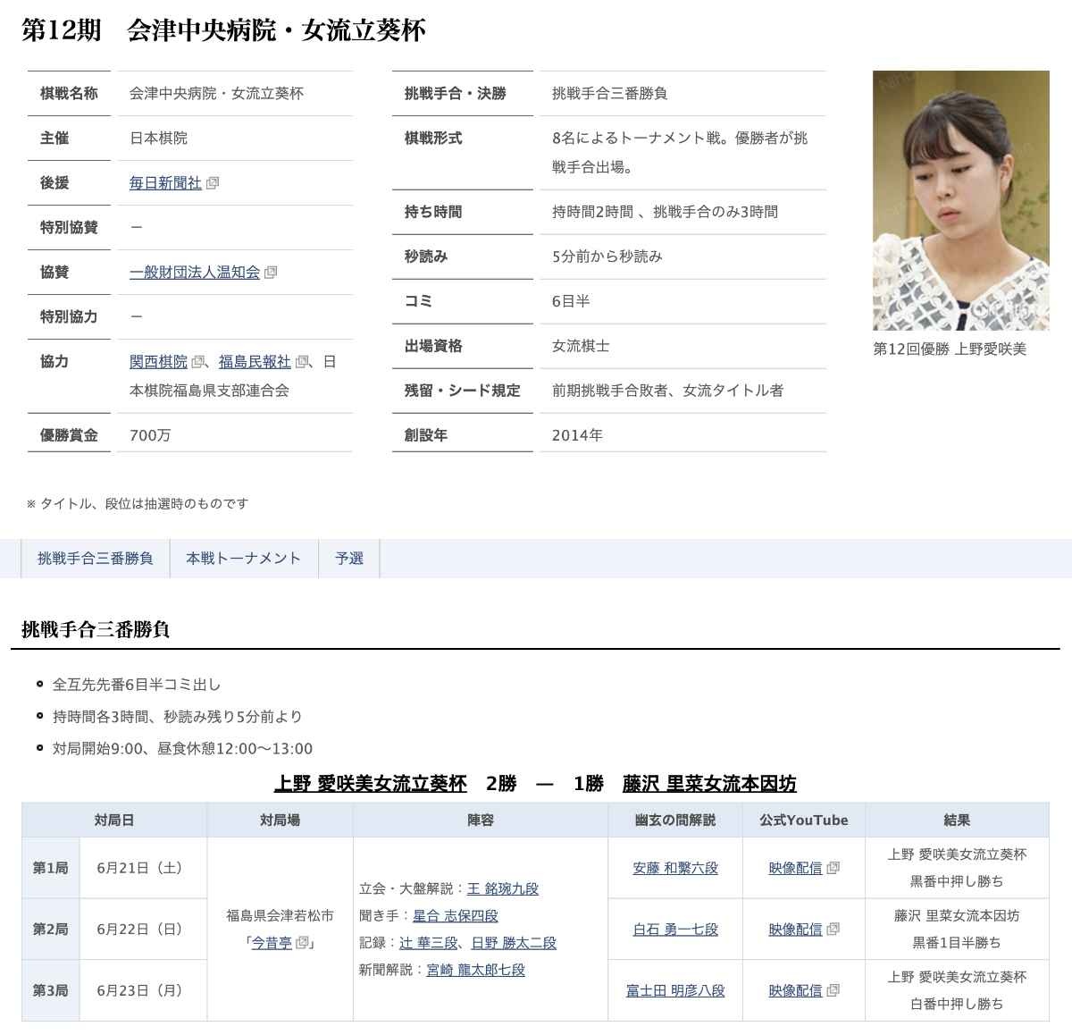 「会津中央病院・女流立葵杯(主催:公益財団法人日本棋院、協賛:一般財団法人温知会」について、諸般の事情により第12期をもって終了することになりましたのでお知らせ致します。