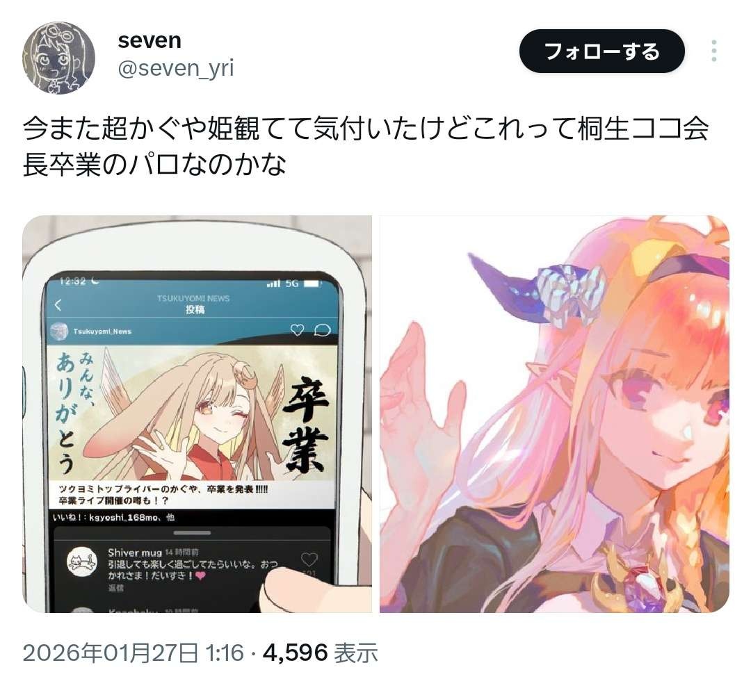 劇中で月に強制送還されるかぐやの卒業配信のサムネが望まない形で卒業させられた元ホロライブVtuber桐生ココの卒業配信サムネと酷似