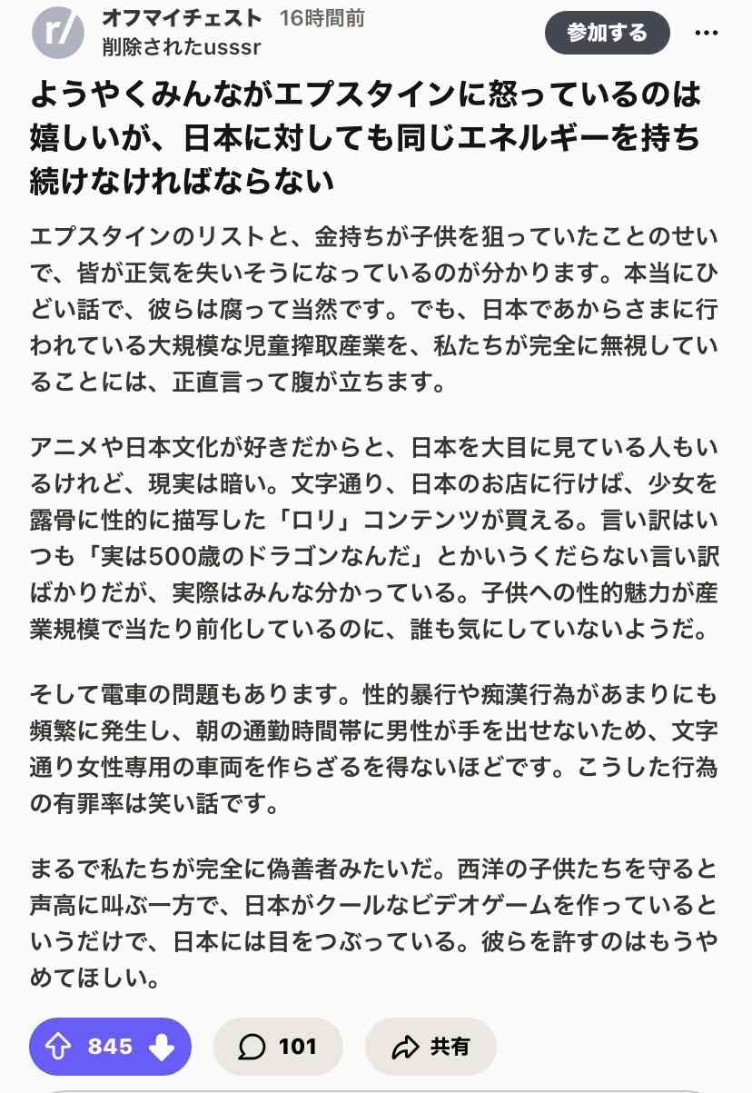 ジャップがロリコンだったとしてエプスタインが消えるわけじゃないのにこの論法世界中で無くならんよな