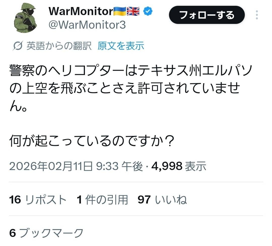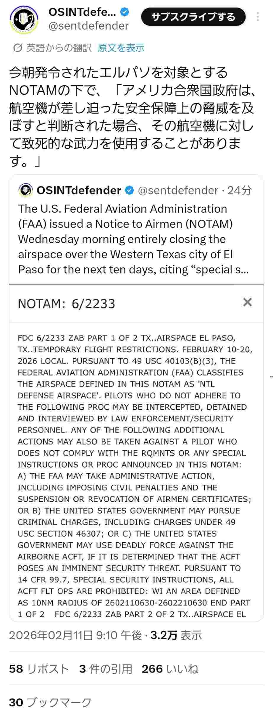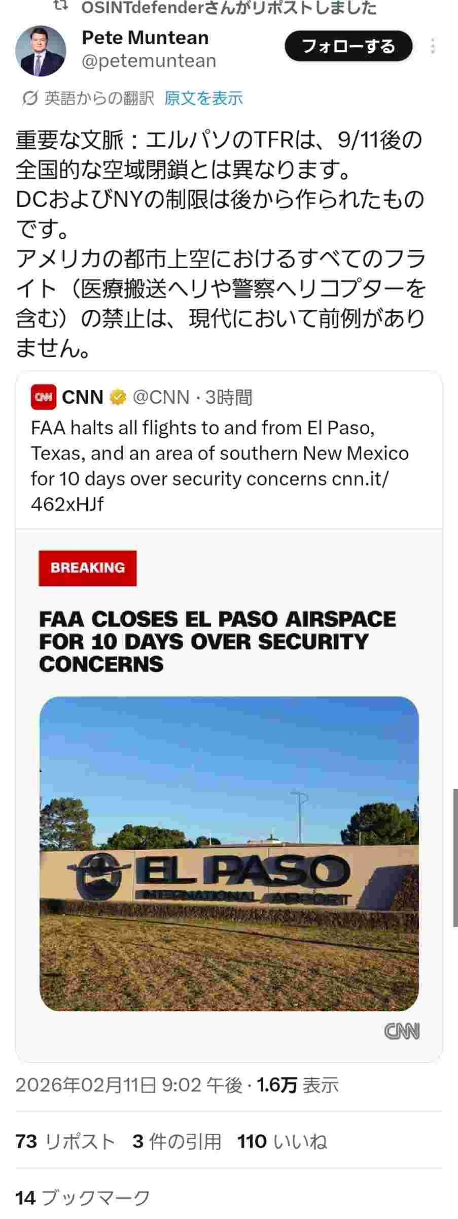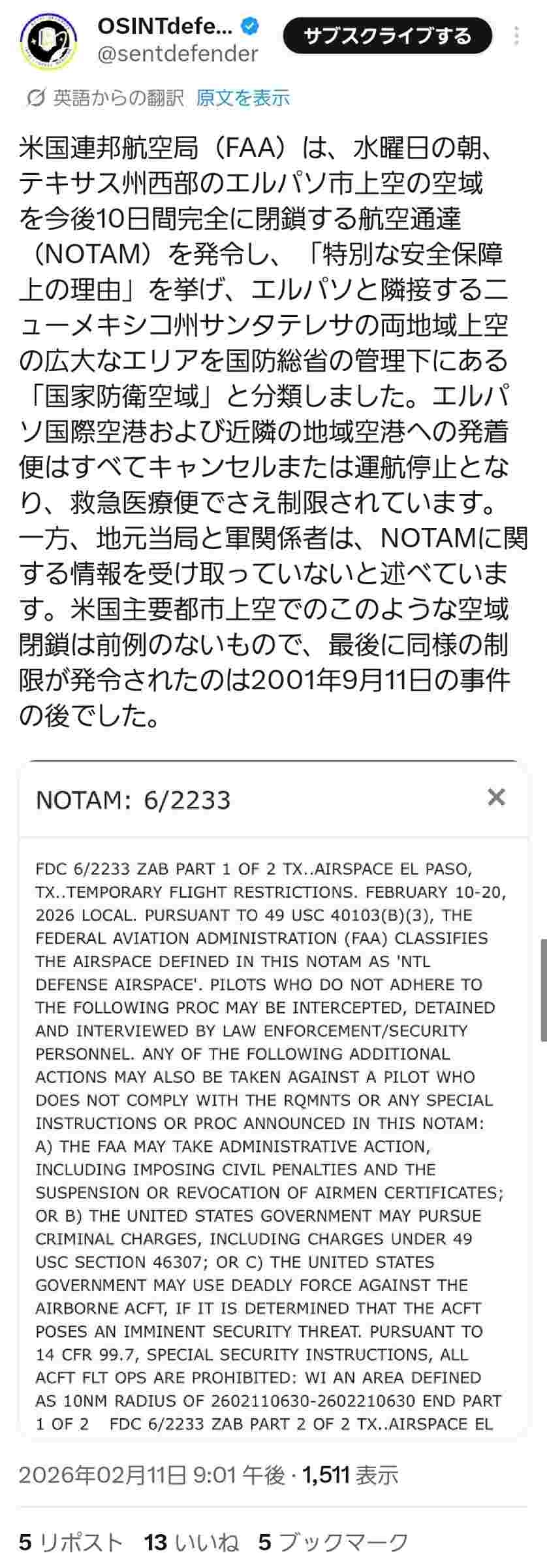 テキサス州エルパソ空港に発着停止措置、FAA「特別な安全上の理由」https://jp.reuters.com/world/us/N2H3DDQSDFO5HARK6AT5VKWHQM-2026-02-11