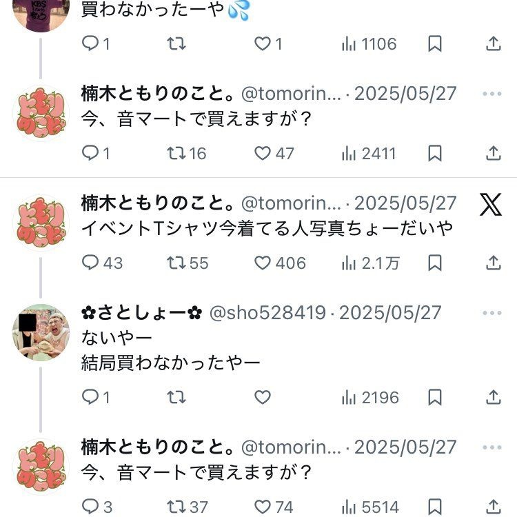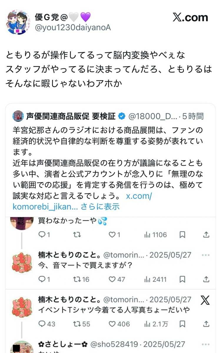 楠木ともりが公式アカウントを通じてファンと交流していたラジオ番組では、グッズ未購入のファンに対して楠木ともり本人が直接リプライを送り、通販購入を促す様子が複数観測されています