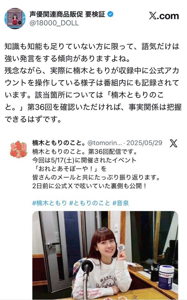 実際に楠木ともり本人がラジオ収録中に公式アカウントを操作し、該当のリプライを送る様子は「楠木ともりのこと。」第36回で確認できる