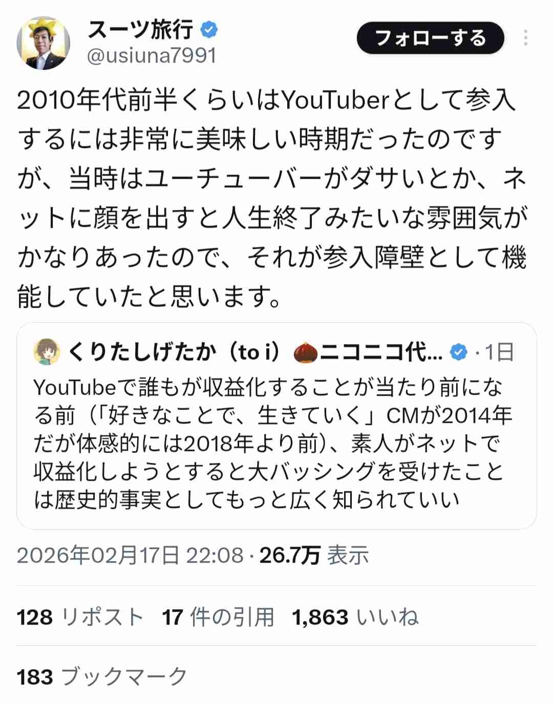 YouTuber黎明期の時中学生やったけど当時はガキですら否定的やったからな