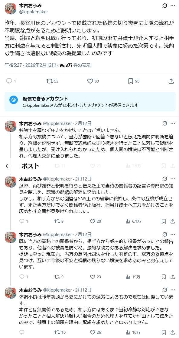2026年2月12日、木古おうみ氏から私を提訴する旨の声明文が出されました。