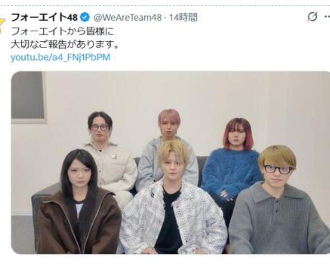 リーダーのこたつは自身のX(旧ツイッター)で「フォーエイトは今年の6月23日をもって活動を終了することになりました」と報告。突然の報告をわびるとともに、「これまで7年間、グループを見てくださった皆様、そして応援してくださった皆様、本当にありがとうございます。ここまで活動を繋いでくれたメンバーにも心から感謝しています」とファンやメンバーに感謝した。