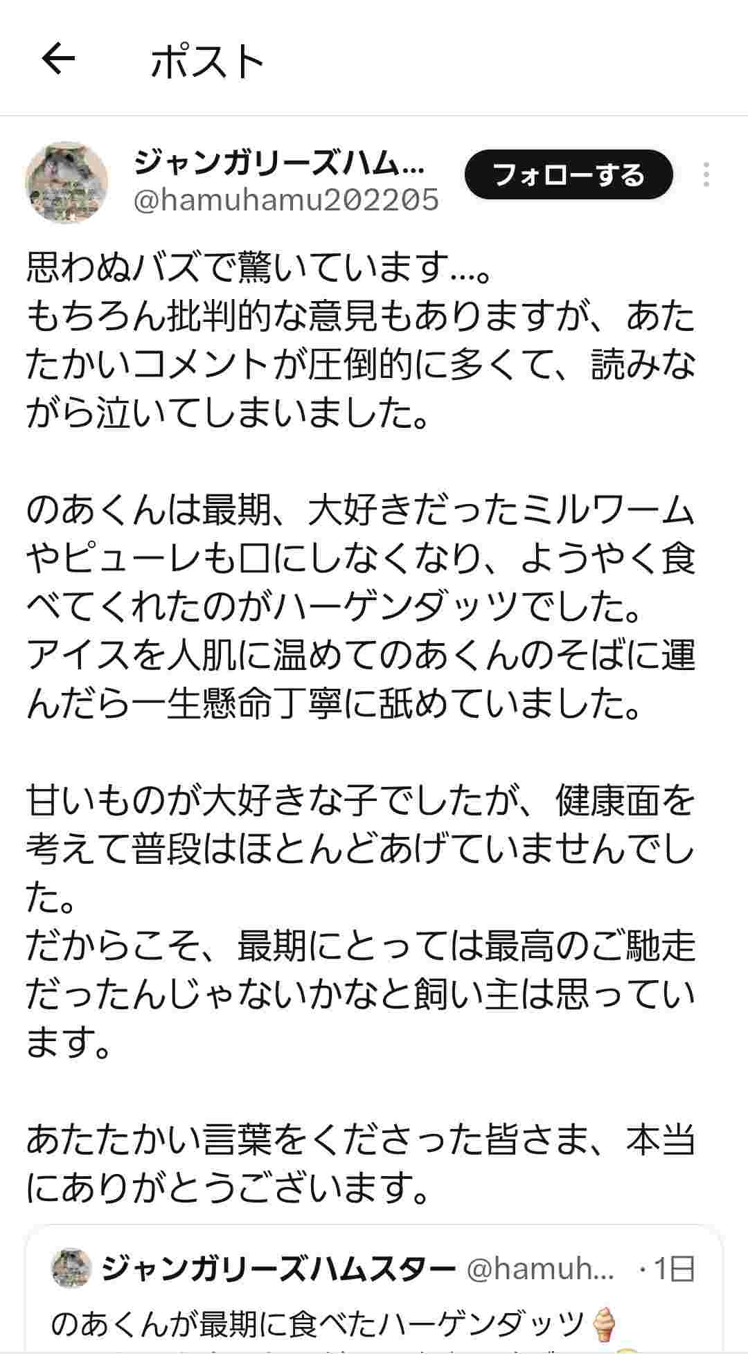 ハムスターが死ぬ前にハーゲンダッツ食いたいって言ってたならいいんやない