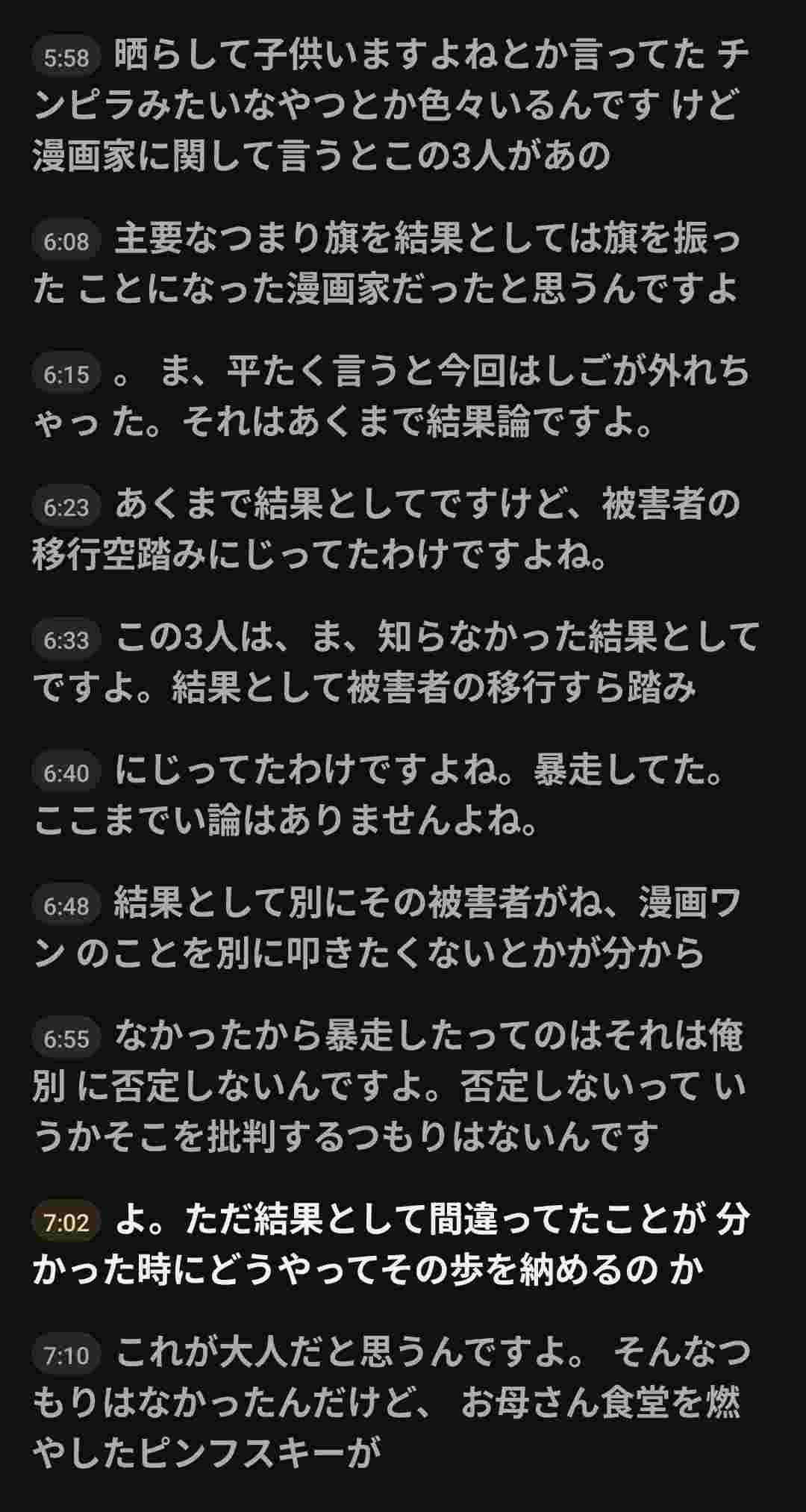�これらの漫画家について、結果として「被害者の意向(小学館を叩いてほしくない等)を無視して暴走し、被害者を追い詰めることになった」と指摘しています。 [06:18]