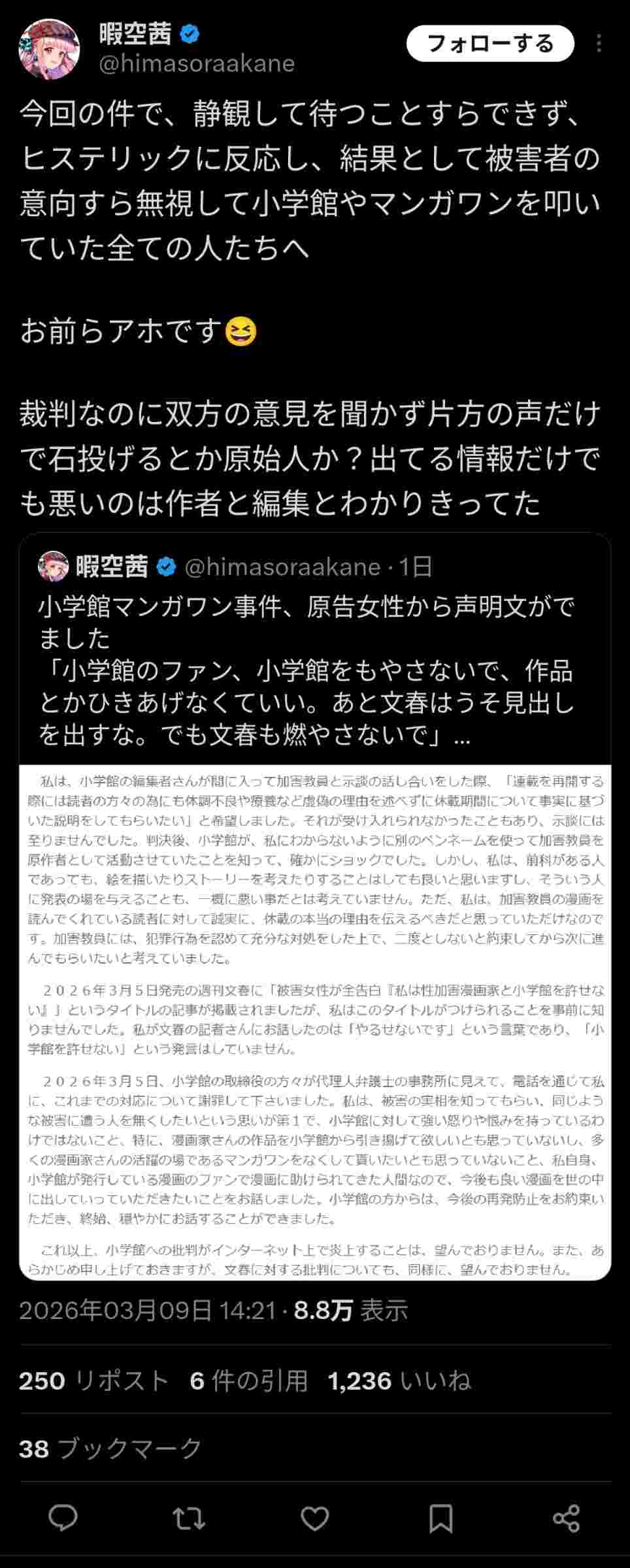 被害者は小学館サイドには特に思うことはないのと編集部の行動に対しての不快感不信感を漫画家たちが抱くのはまた違う話やろ