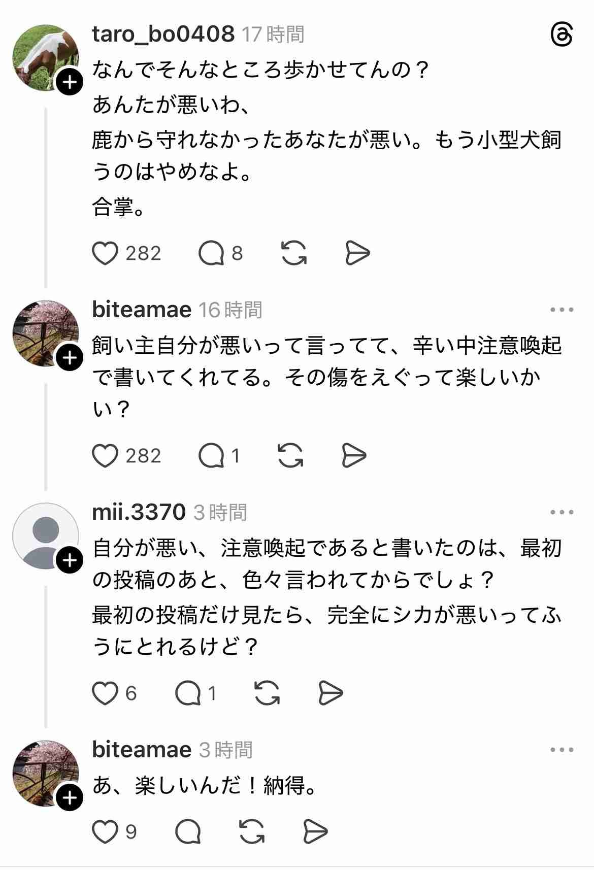 鹿からしたら敵意剥き出しで吠えといてこんなんで死ぬなよってなもんやろ
