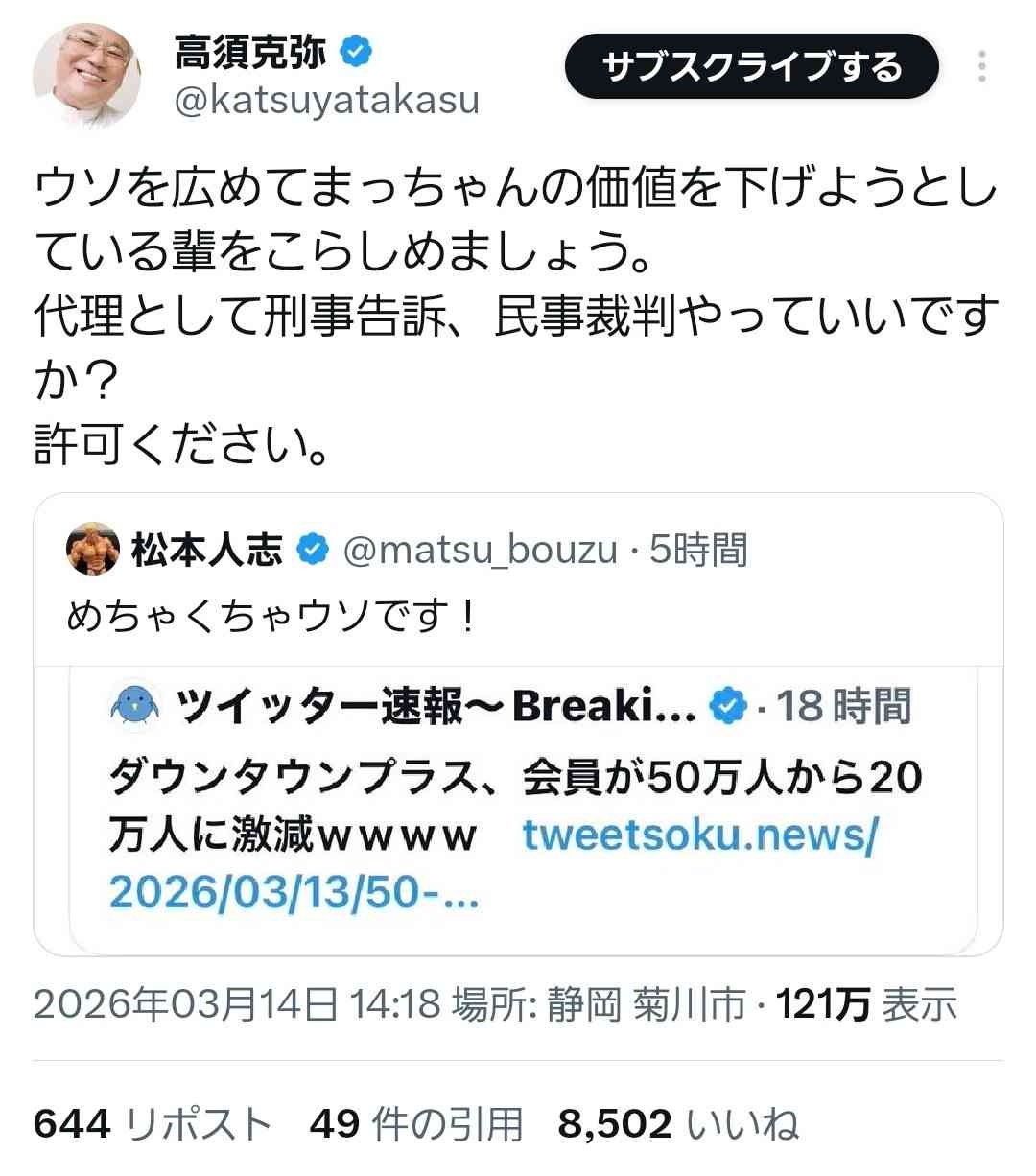 前の事実無根なので戦います裁判も辞めちゃったのにこんなのでまたやるか?