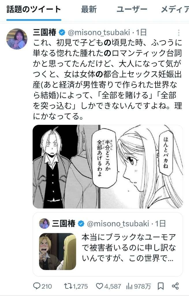 炎上してるのは何故かハガレンを引用してるフェミ