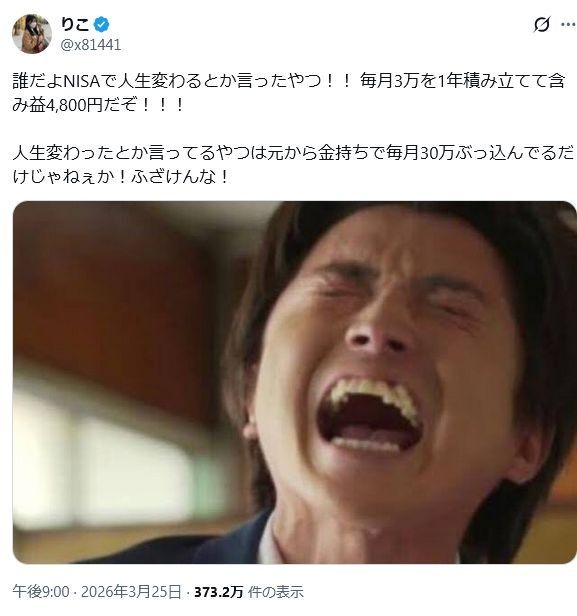 新NISA民絶叫「誰だよNISAで人生変わるとか言ったやつ!! 毎月3万を1年積み立てて含み益4,800円だぞ!!!」