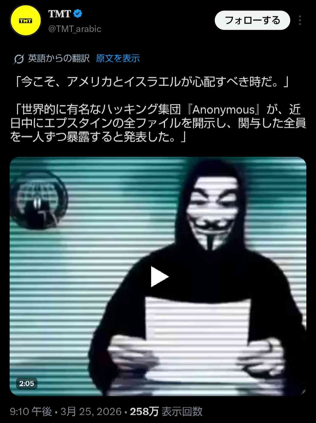 ハッカー集団anonymous「エプスタイン文書のハッキングに成功した。関与した全員を1人ずつ暴露していく」