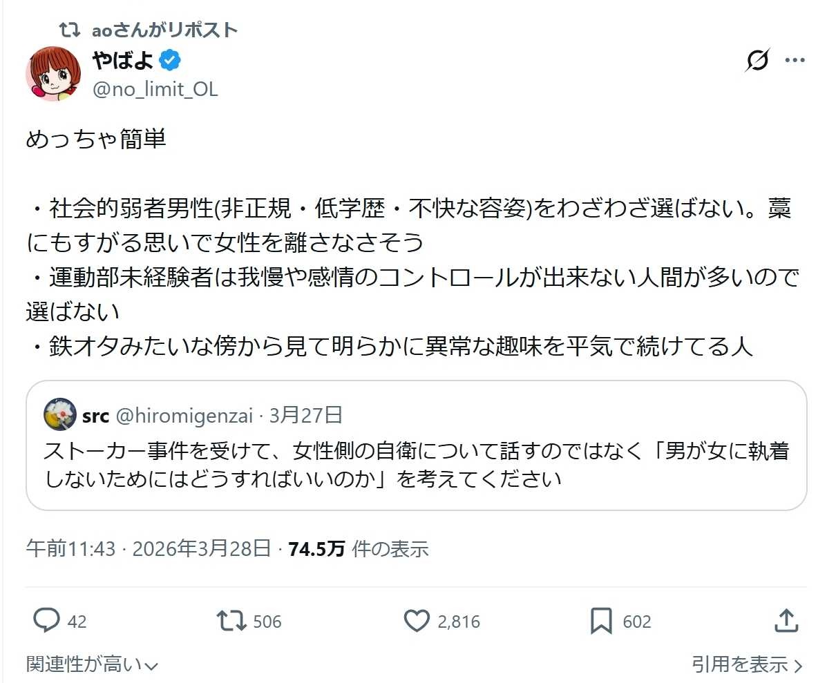 20超えて正社員じゃない奴がストーカーになる