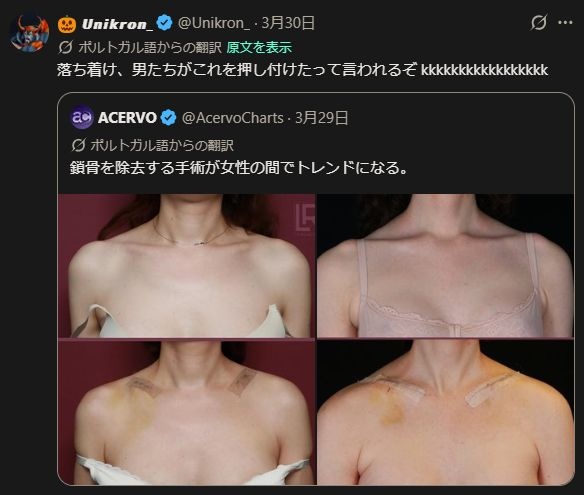 美容整形外科のステマだろ、鎖骨切り落とすだけで数十万とか最高やな