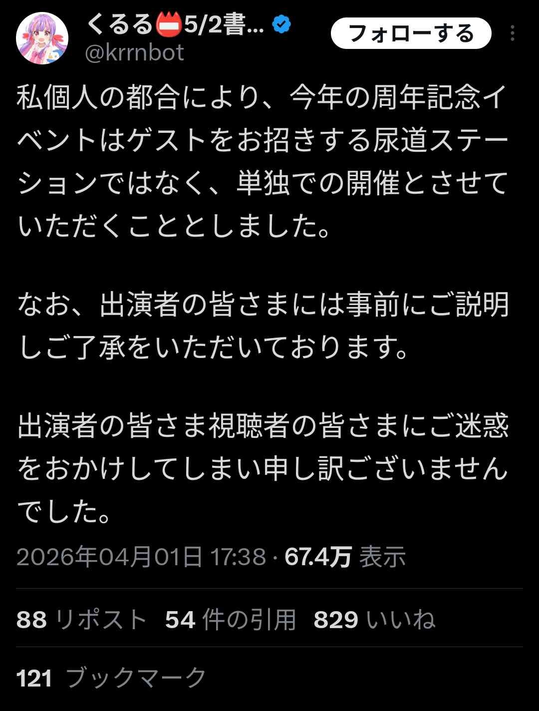 「あっくるる先生とのコラボはなくなりましたね…何か企画自体がなくなったみたいですね…はい…。なんでかは…あの分からない、多分くるる先生が気遣ってなくなるとだけ言ってくださったんですけど、多分俺のせいなのかな?