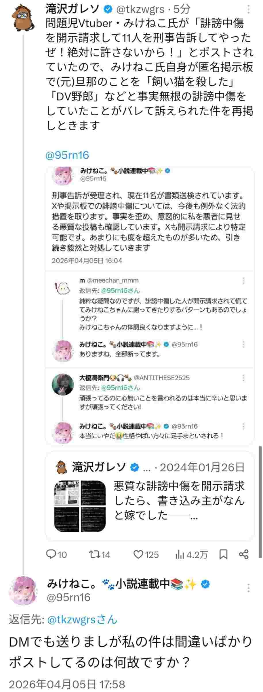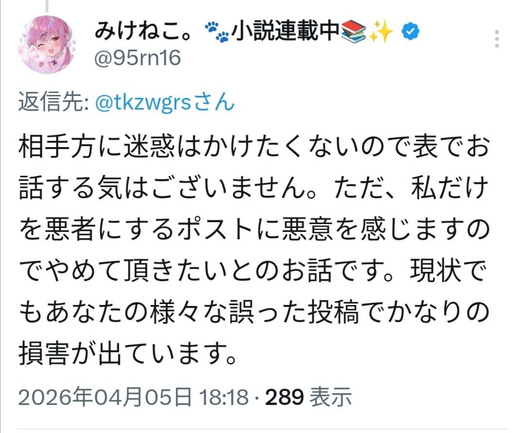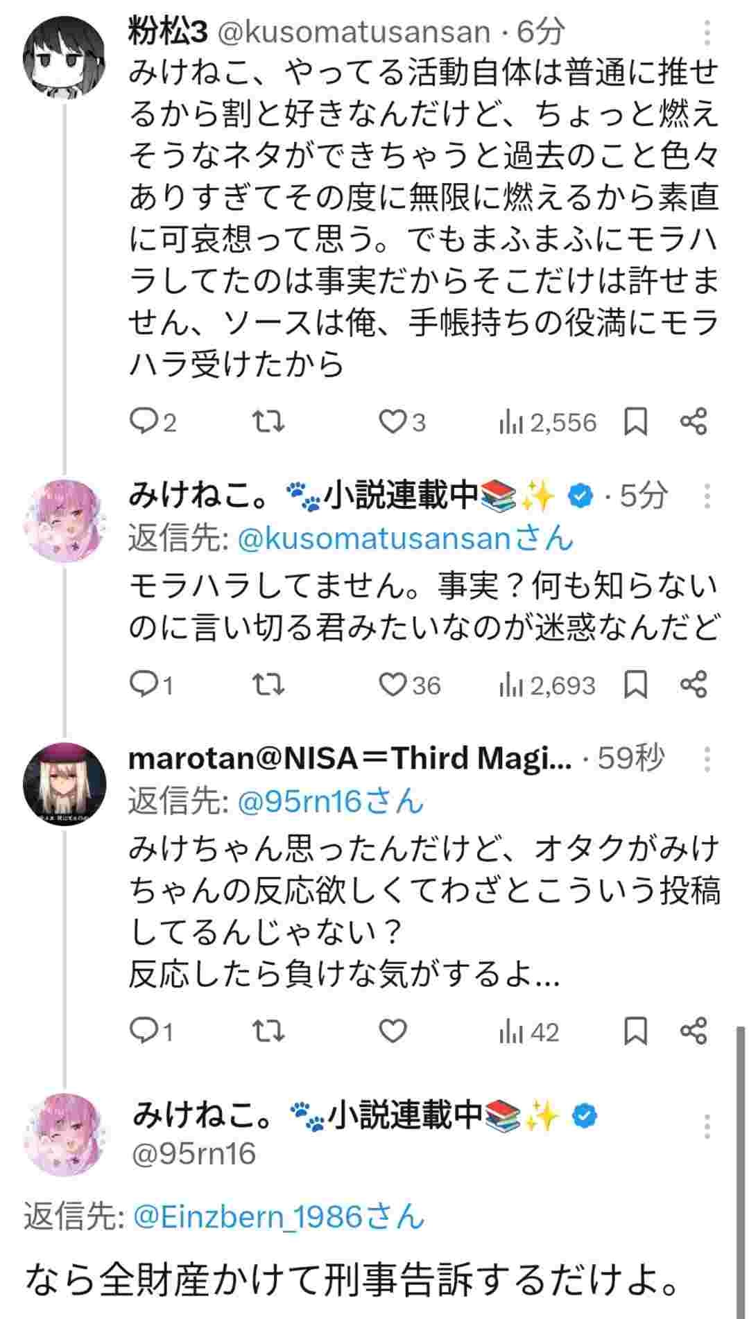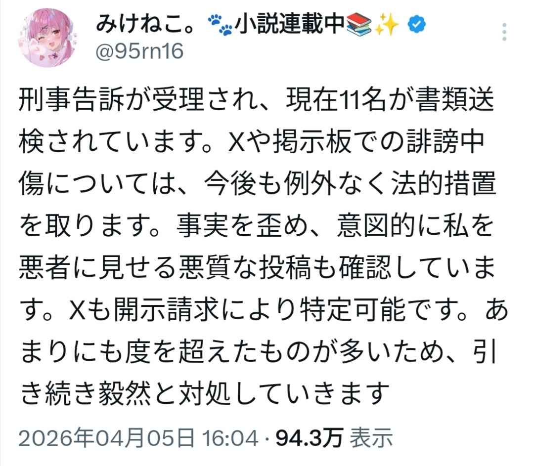 ええけどみけねこは一般人には誹謗中傷で訴えまくってるんやから日和るなよ?