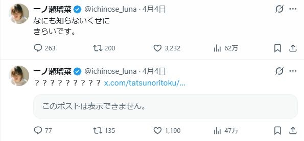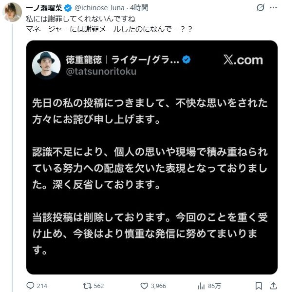 このライター謝罪したと言ってたが一ノ瀬瑠菜に対して言ってたと自覚あったんか