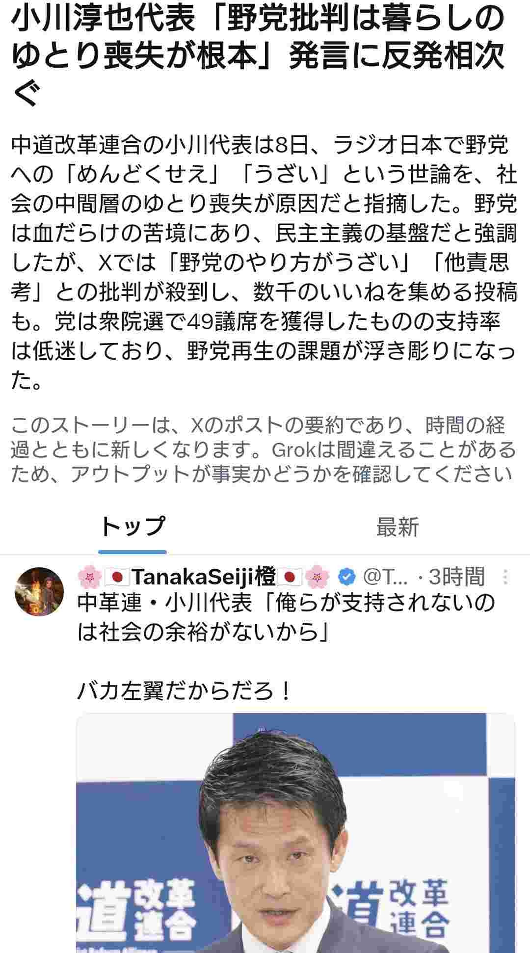中道・小川代表「中道が支持されないのは有権者の余裕が無いからだ」 ←批判相次ぐwww