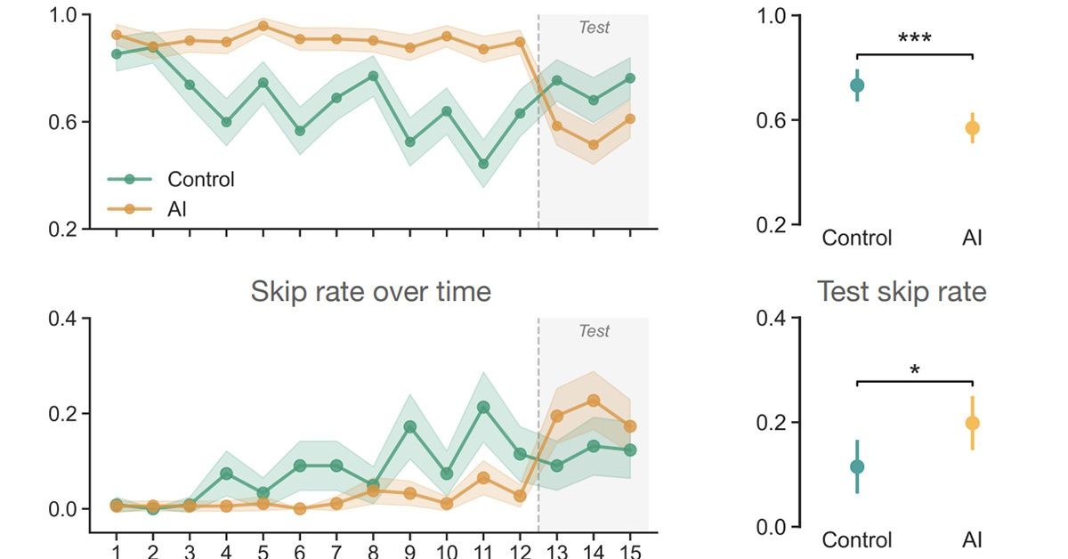 結果は3実験とも一貫していた。AI利用群はAI利用中こそ高い正答率を示すが、AIを取り上げられた途端に正答率が落ち、スキップ率も上昇した。また、2回目の実験で「AIをどのように使用したか」をたずねたところ、「答えを直接得るため」にAIを使った参加者が最も成績を落とし、スキップ率も高かった。一方、ヒントや説明を求める使い方をした人や、ほぼ使わなかった人は、対照群と同等以上の成績を維持していた。