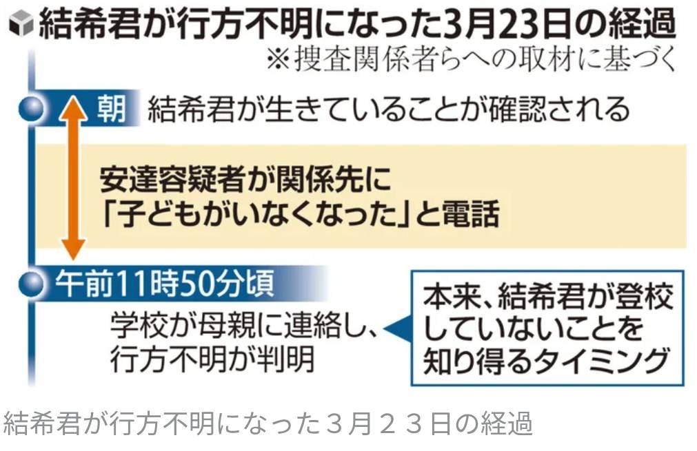 京都府南丹市の山林で市立園部小の安達結希(ゆき)君(11)の遺体が見つかった事件で、死体遺棄容疑で逮捕された養父の安達優季(ゆうき)容疑者(37)が、学校から「結希君が登校していない」と知らされる前に、関係先に「子どもがいなくなった」と電話していたことが、捜査関係者への取材でわかった。