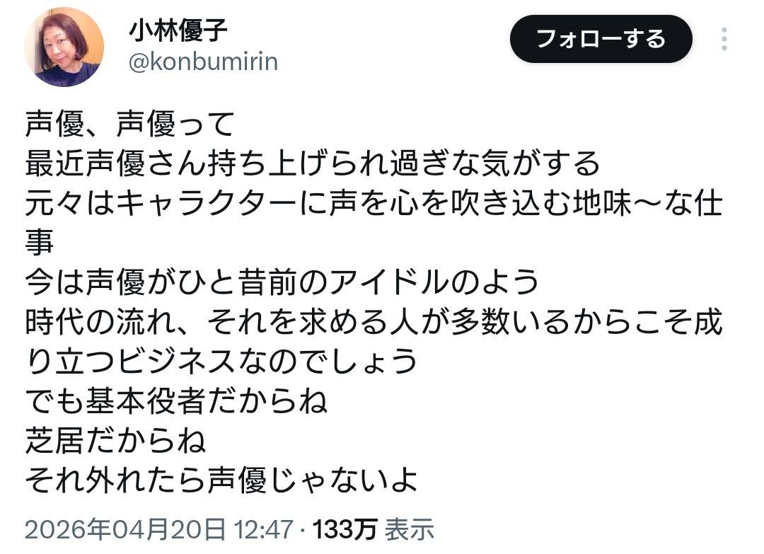 でも「役者から外れたら声優じゃない」についてはそのとおりなわけで