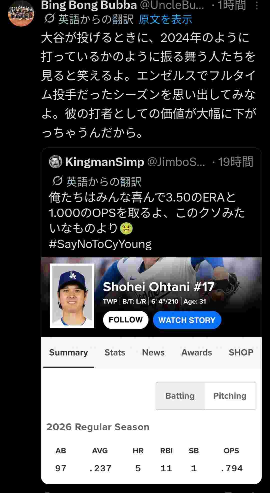 いつもの大谷アンチが不調の今なら叩けると嬉しそうにしてるだけ