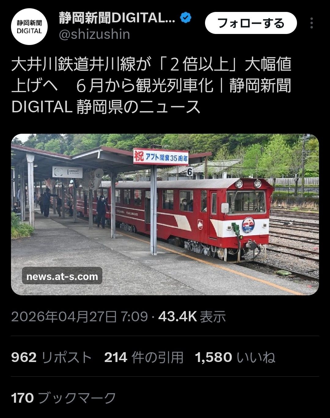 大井川鐵道は全列車を観光列車にすることで運賃を変えずに特別料金を徴収することで実質値上げするらしい