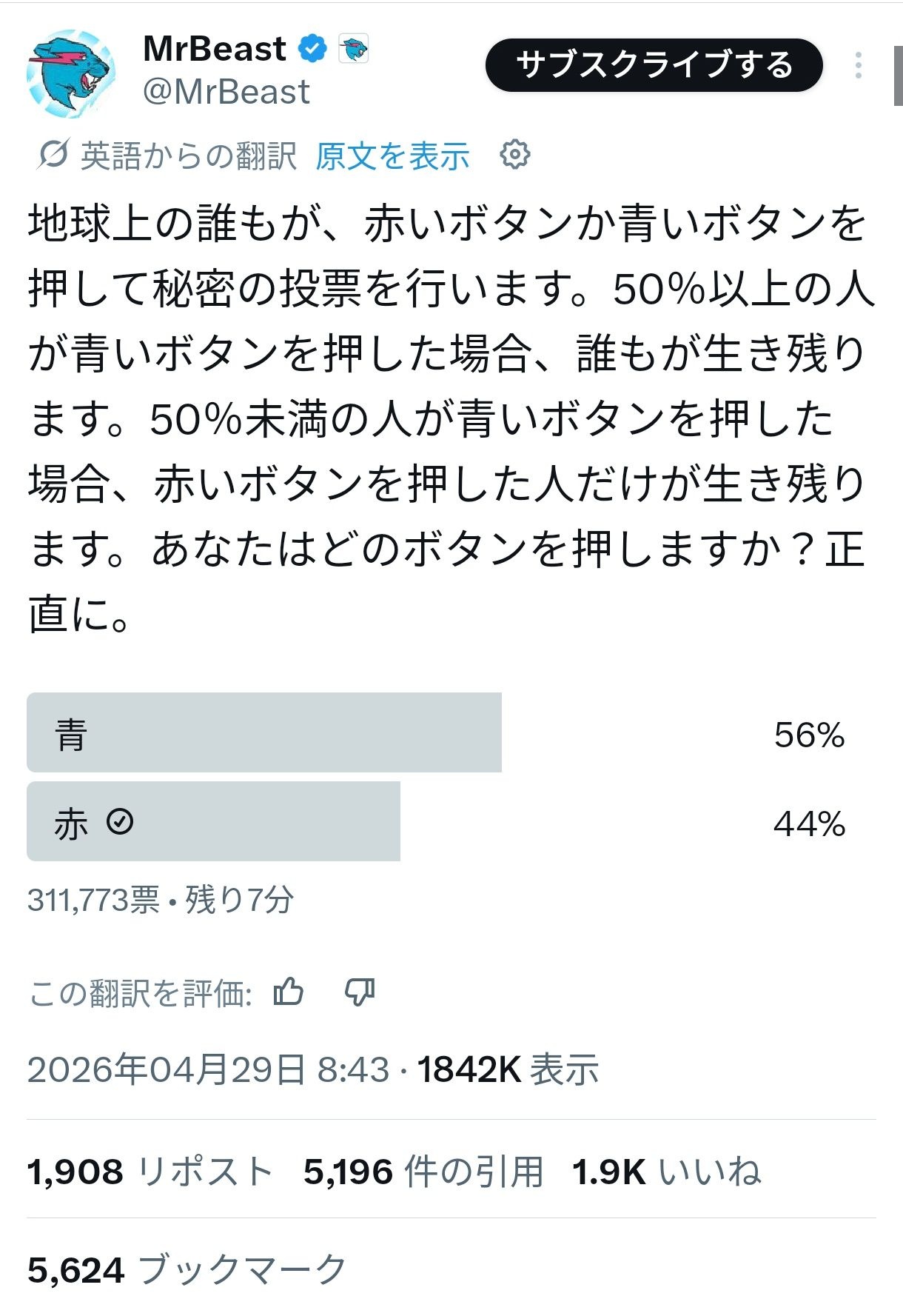 赤押すようなやつが少数残ったらヤバい世界になりそうだから普通に青押すわ