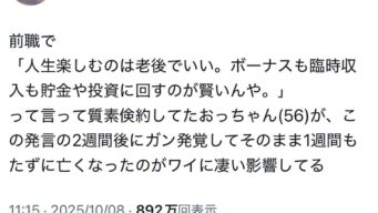 エッヂ 投資おじさん(56)「人生楽しむのは老後でいい」→2週間後に癌発覚して死亡